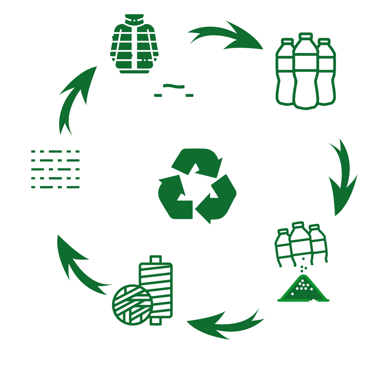 回收聚酯織物由已經使用過的寶特瓶(PET瓶)製成,它可以減少54.6%的碳排放,並減少從PET瓶磚到回收聚酯紡絲生產的能量損失約40-85%。